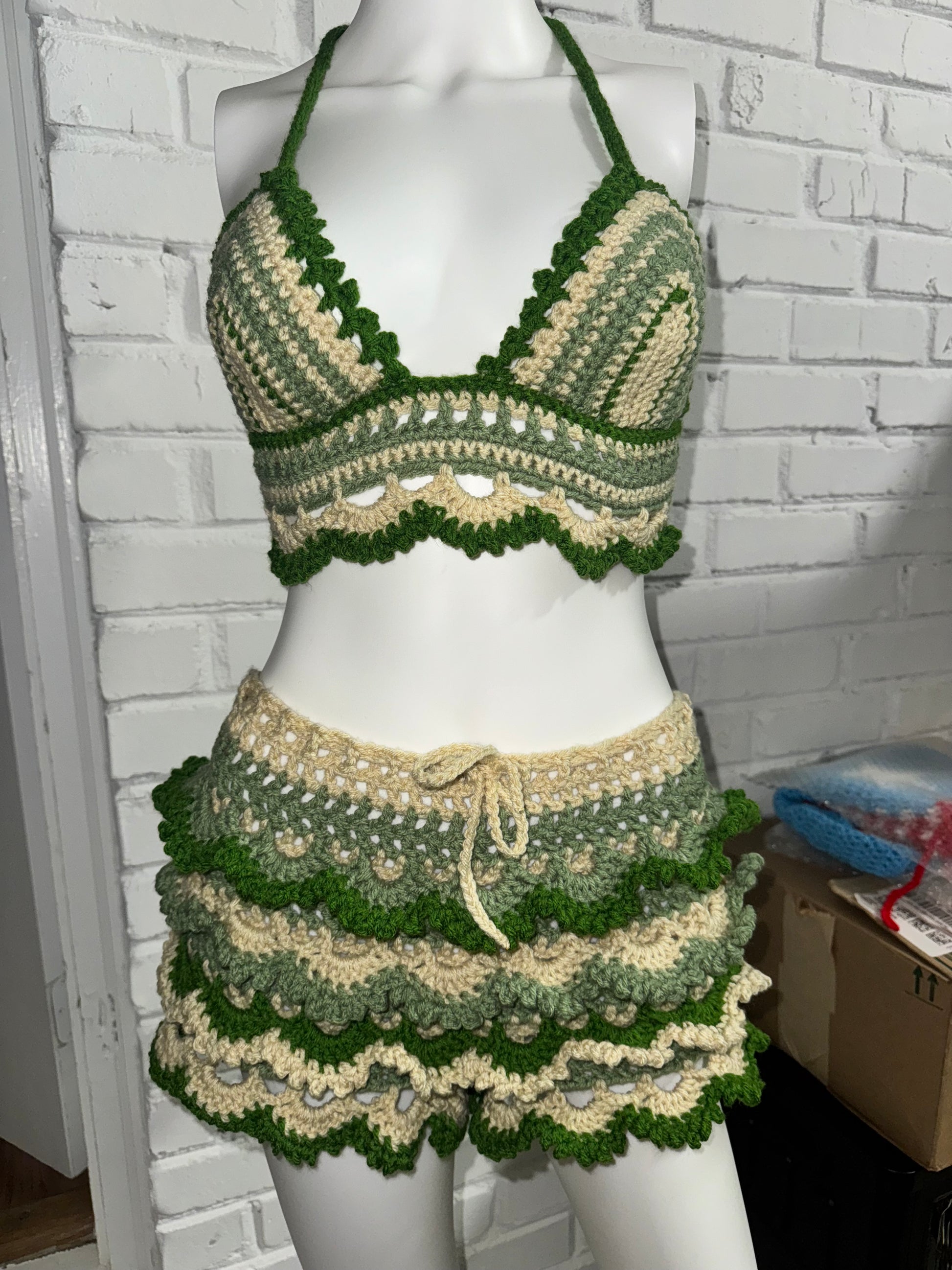 Green Ruffle Shorts Crochet Matching Set Fairycore